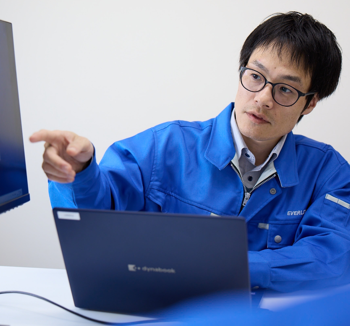 現在の情報システム課の仕事は大きく二つに分けることができます。まずは、既存システムの保守運用と各社員からのシステムに関する問い合わせの対応です。具体的には基幹システムのカスタマイズやメンテナンス、セキュリティ対応、各社員が使用している業務用パソコン関係の問い合わせ、ネットワークのトラブル対応など、多岐にわたります。特に、入社や異動などで人の入れ替えが多い時期は、ユーザー対応に多くの時間を要しています。普段、パソコンに触れる機会の少ない部署からは基本的な操作に関する問い合わせも多く、各人のPCスキルに合わせた個別対応が必要となります。後は、新システムの導入とその後の運用管理となります。こちらはシステムを導入する部署と協力の元でプロジェクトを進行していきます。オンラインでの対応も増えましたが、機器を含めたシステム導入の場合、必要に応じて現地へ行って対応も行っています。柏原工場をはじめ、東京や九州の営業所の他、時には海外からの問い合わせもあります。非常に広範囲な業務となりますが、私にとってそれらは新鮮で、こういう仕事もあるのか、と感じることが今でもあります。